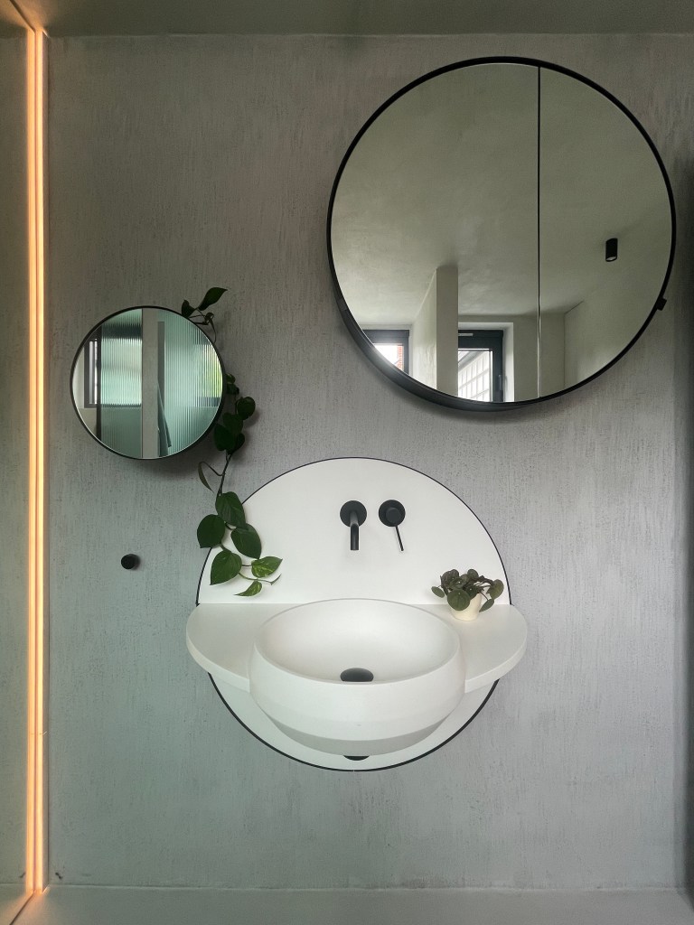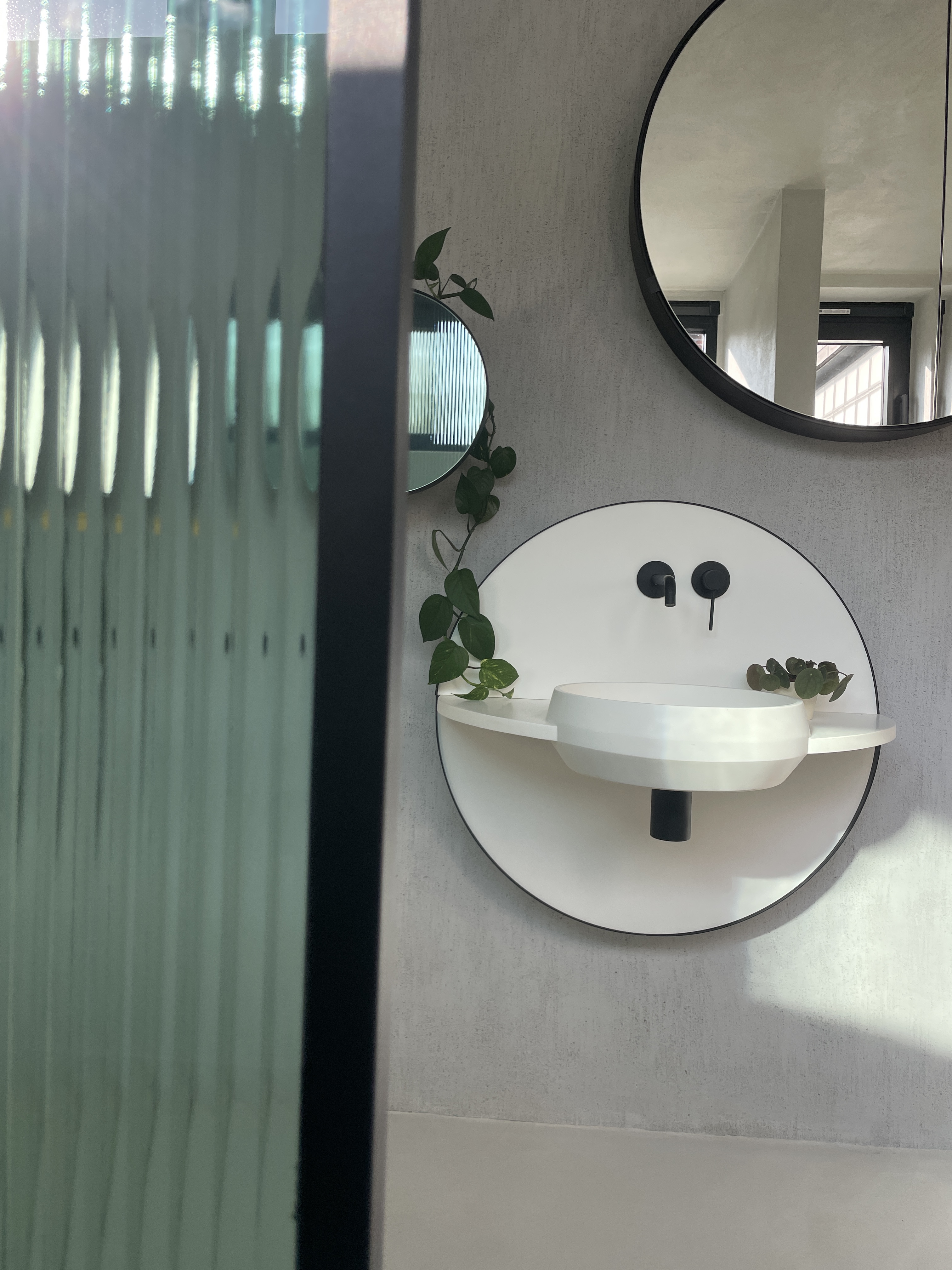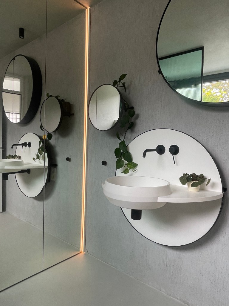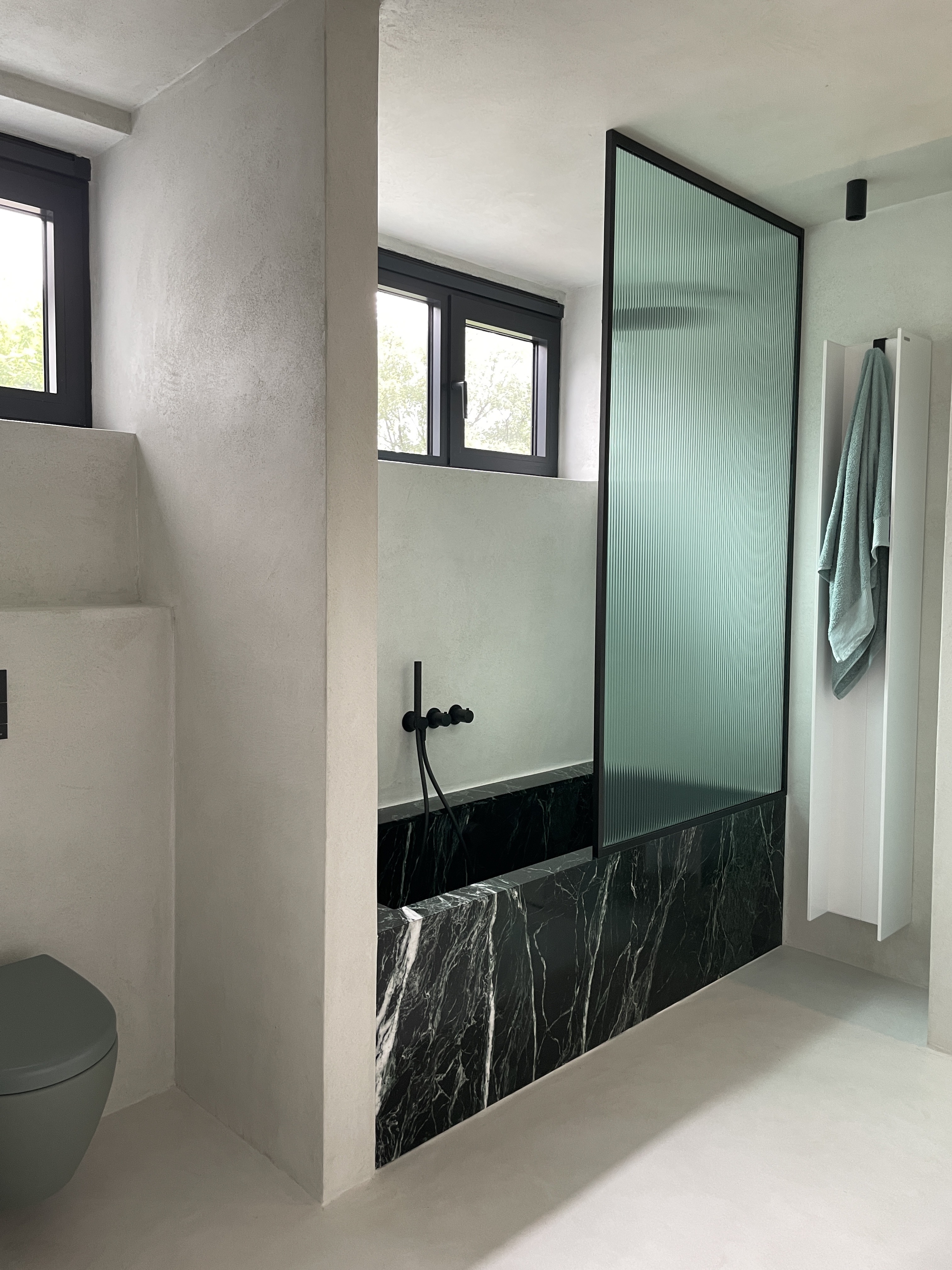 De nieuwe groene badkamer is klaar om te bezichtigen in de showroom. Het groene marmeren bad komt rechtstreeks uit Italië, de ronde speelse vormen komen uit de collectie van Ex.t. Alles wordt geblend door de lichtgroene stucco die op de wanden doorloopt naar het plafond en een warme minimale uitstraling heeft.