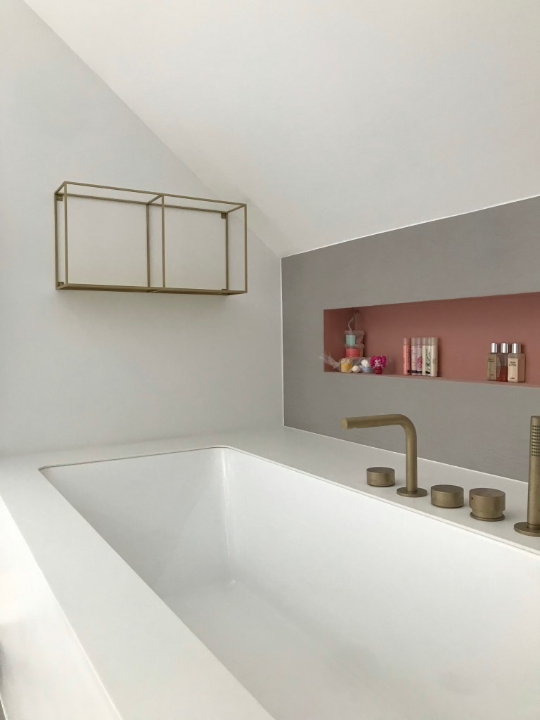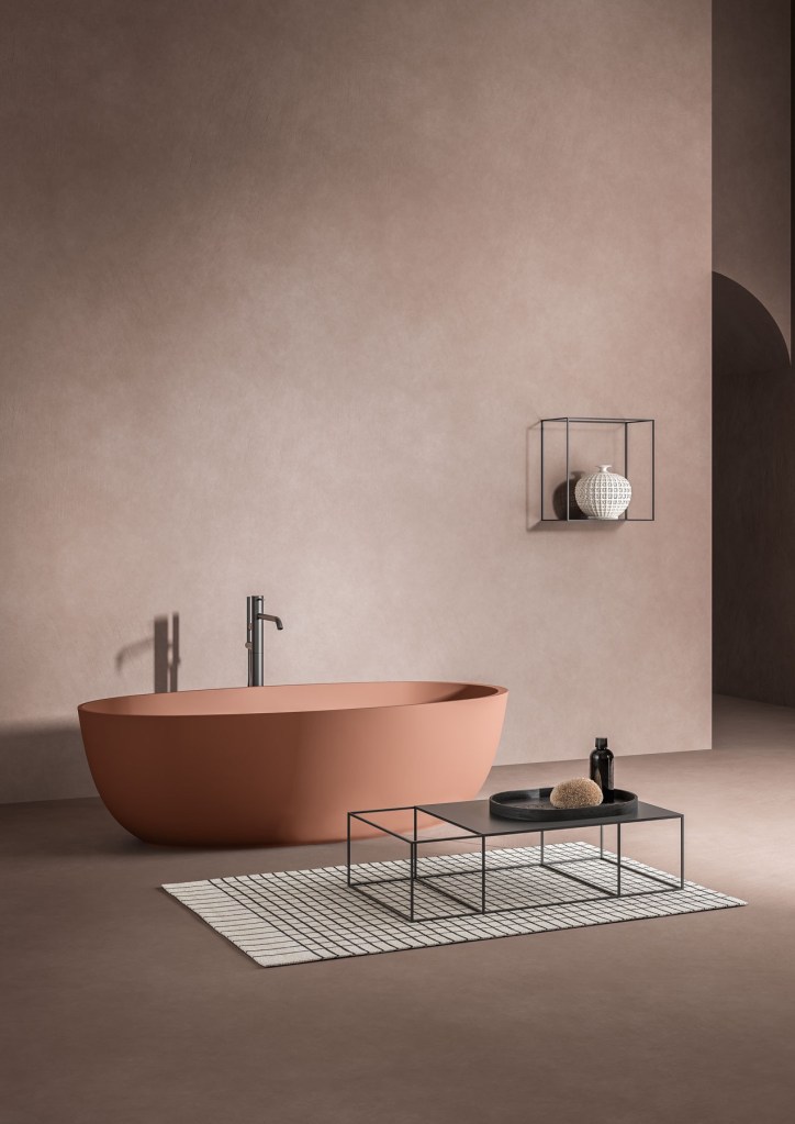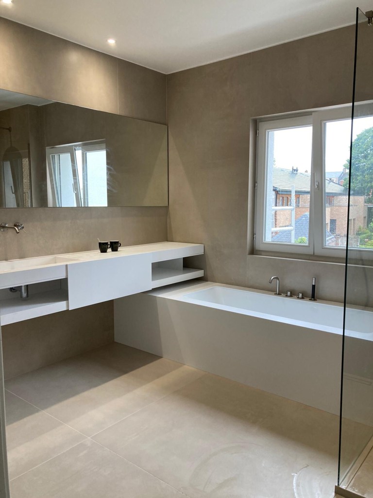Dit bad heeft zowel aan de binnen- als buitenkant dezelfde afwerking, wat zorgt voor een strak, homogeen design. De afwerking gebeurt ter plaatse, in een materiaal naar keuze zoals microcement, mortex, marmer, tegels …