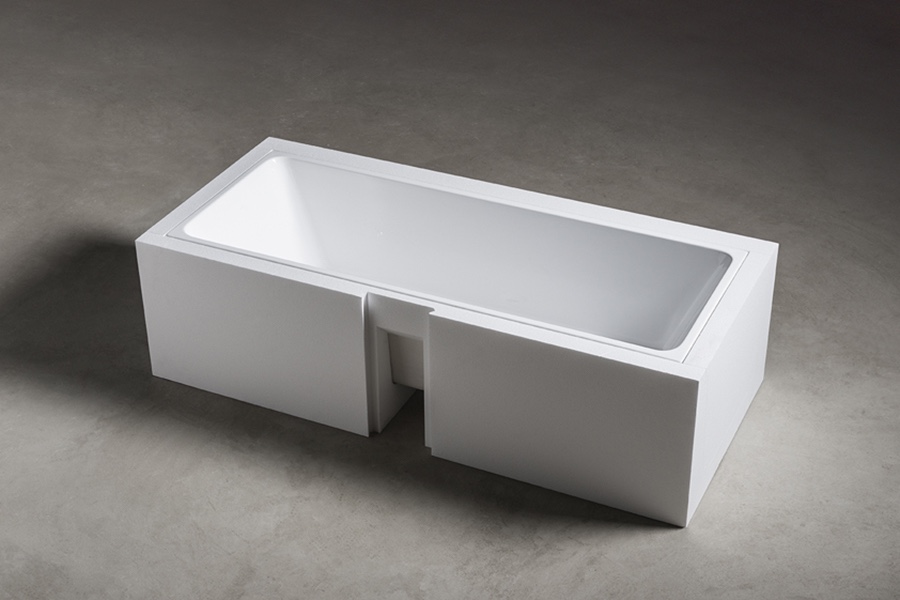 De baden bestaan uit mat of glanzend acryl, verlijmd in een blok EPS-schuim (hard piepschuim), wat zorgt voor snelle, droge montage. Dit schuim maakt het bad extra stevig en houdt het water langer warm door de isolatie.