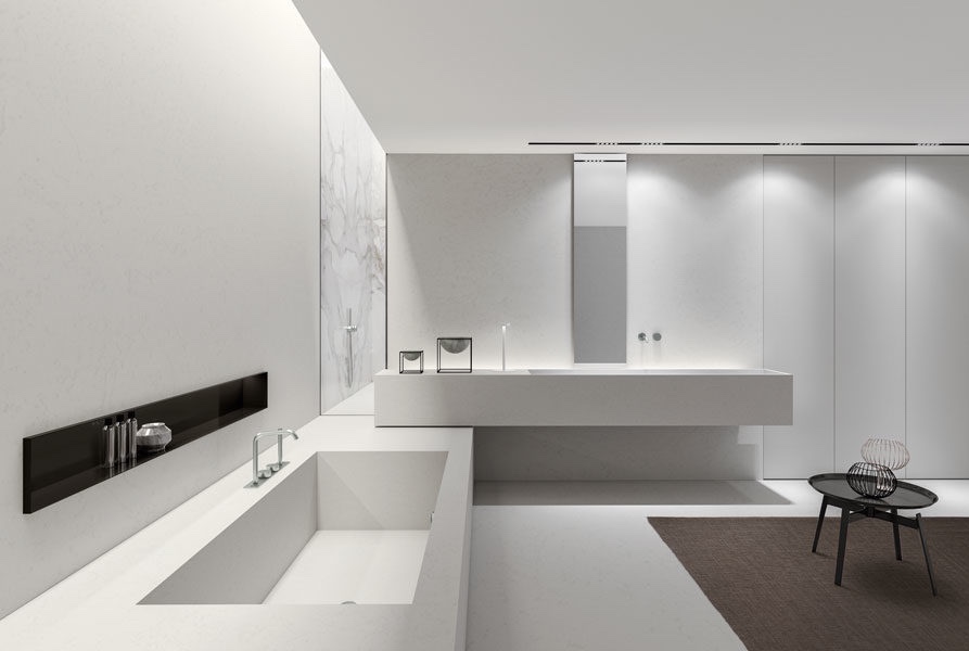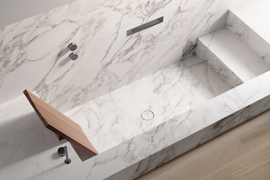 De afwerking kan op maat besteld worden in materialen zoals marmer, Corian, thermowood, keramiek, eco-cement of waterdichte technopolymeer (afwerkbaar met microtopping, mortex of PU-gietvloer).