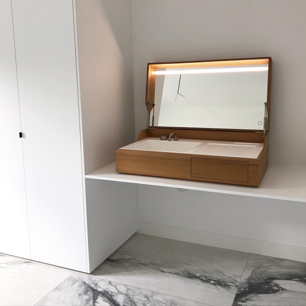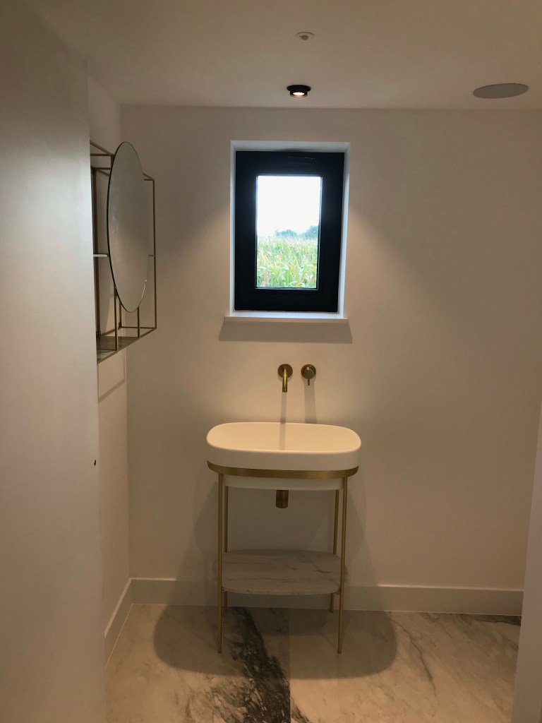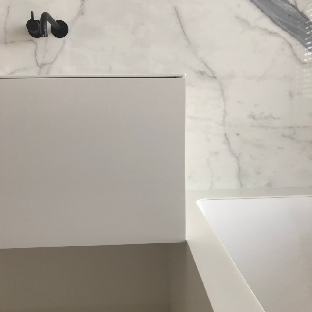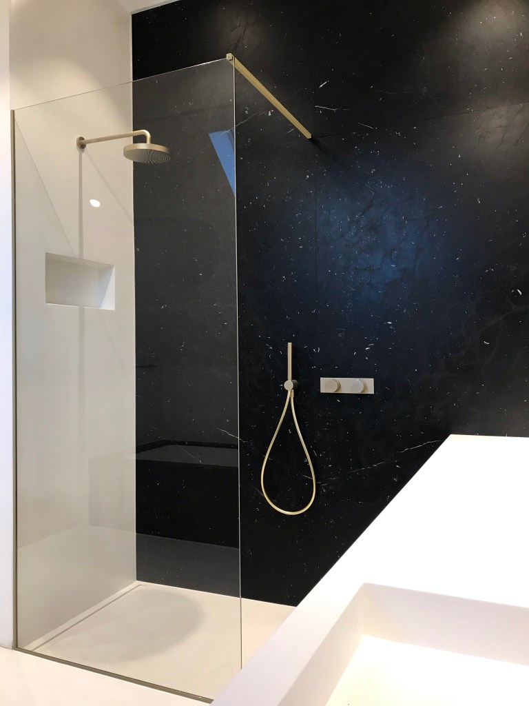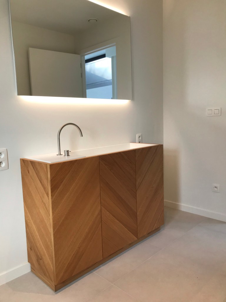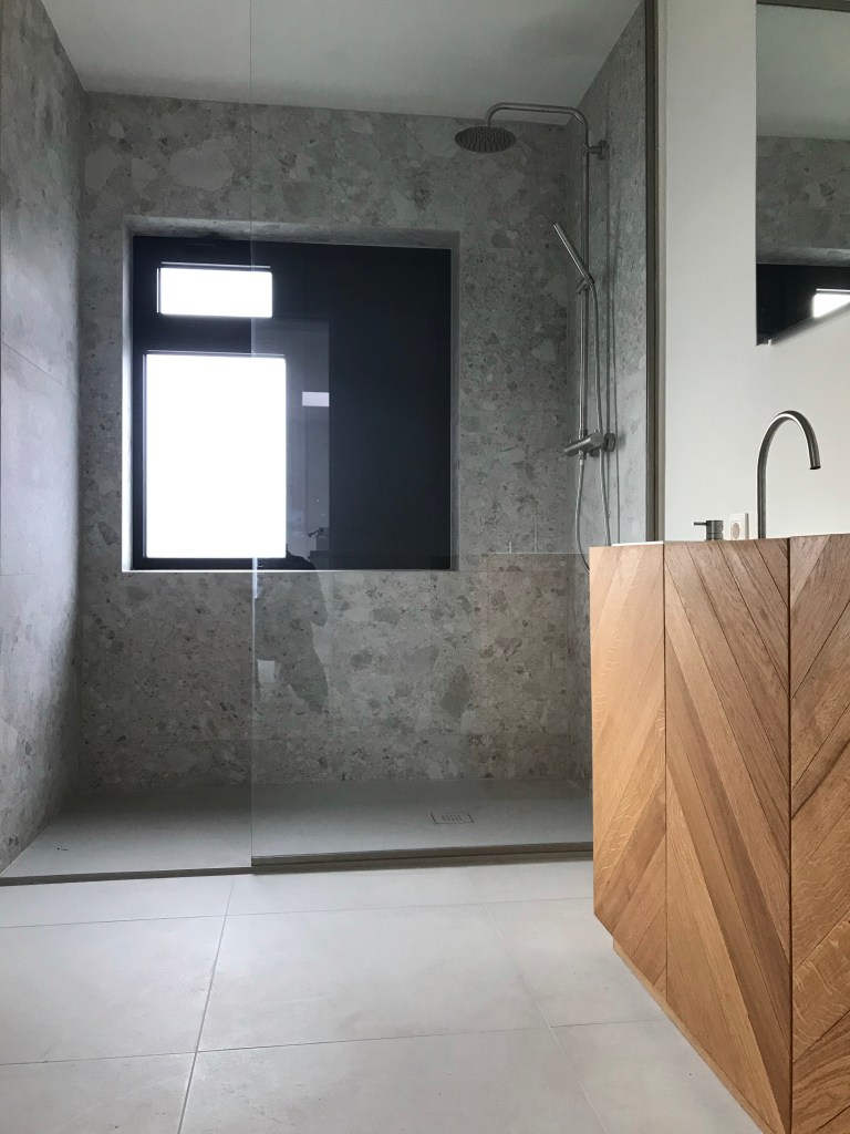 De klant wou er een ruime badkamer in creëren, met veel licht en opbergruimte en een douche die wat privacy gaf. De stijl moest natuurlijk bij de woning passen maar met een strakke boventoon. Marmer / eik en Corian waren de te gebruiken materialen.