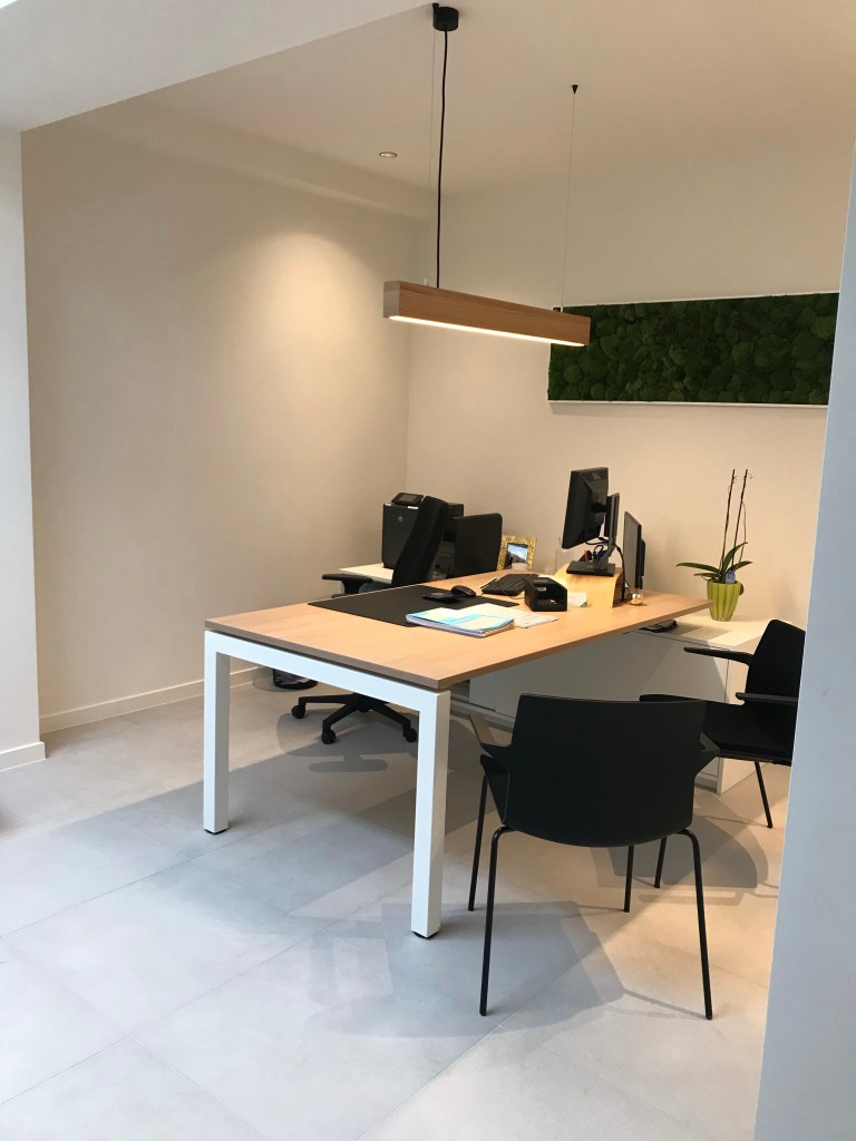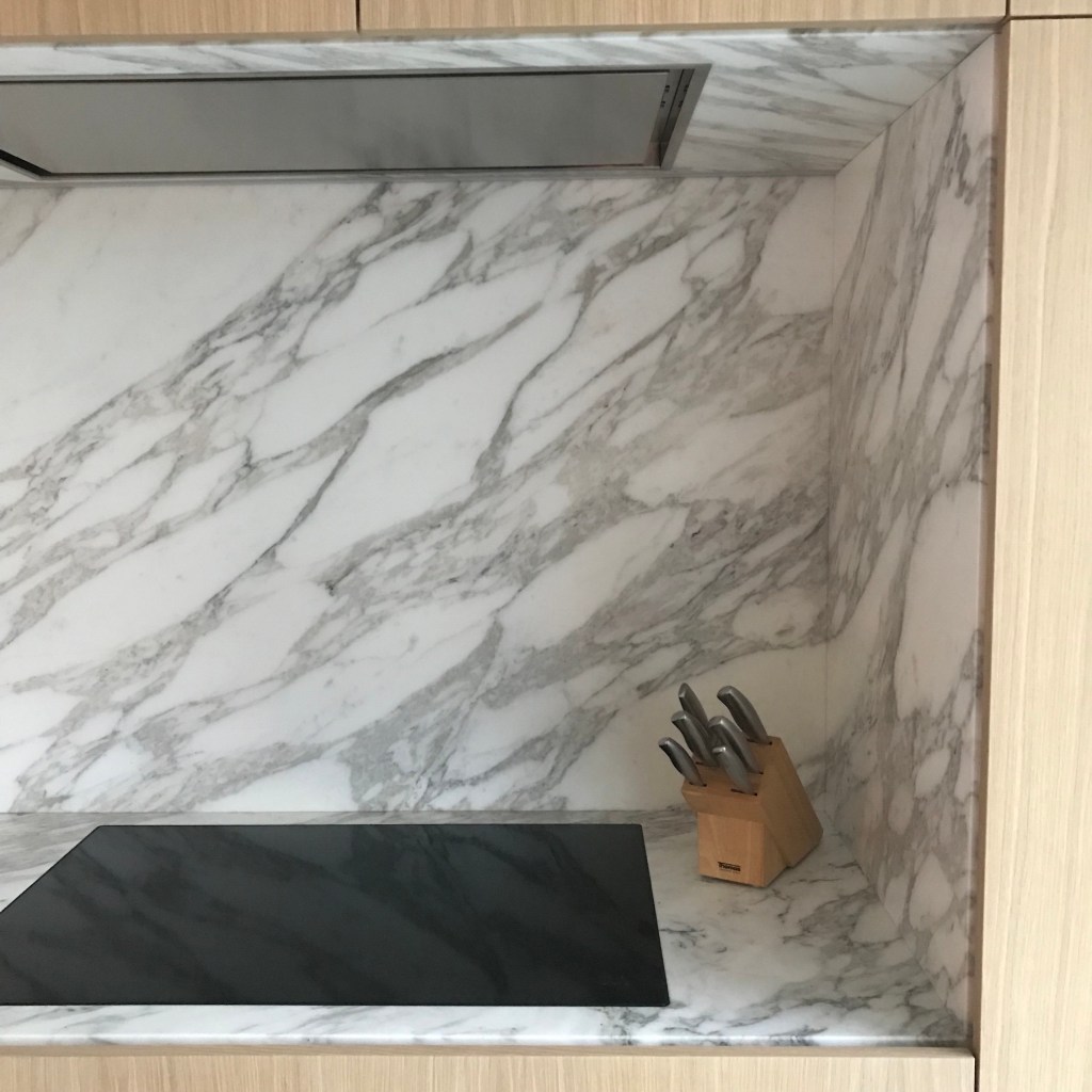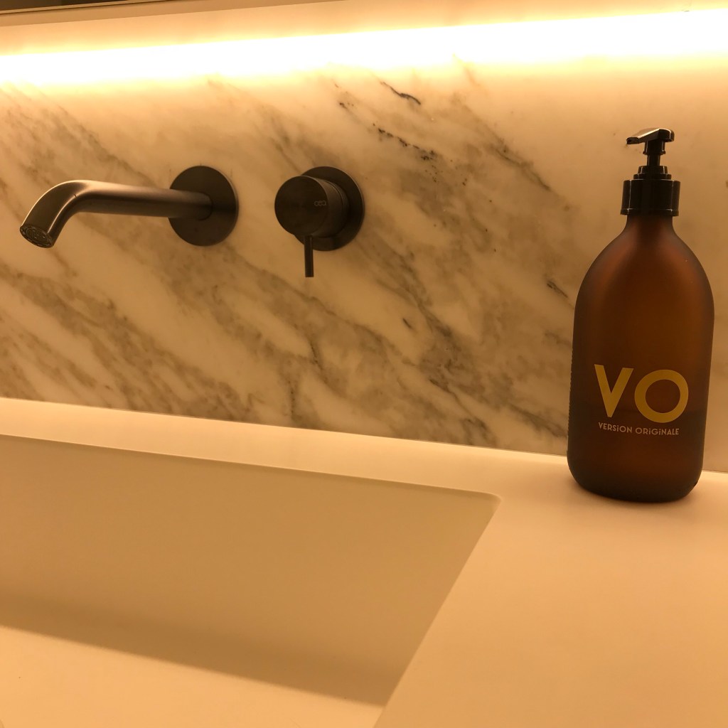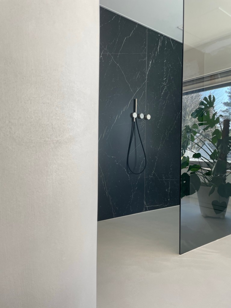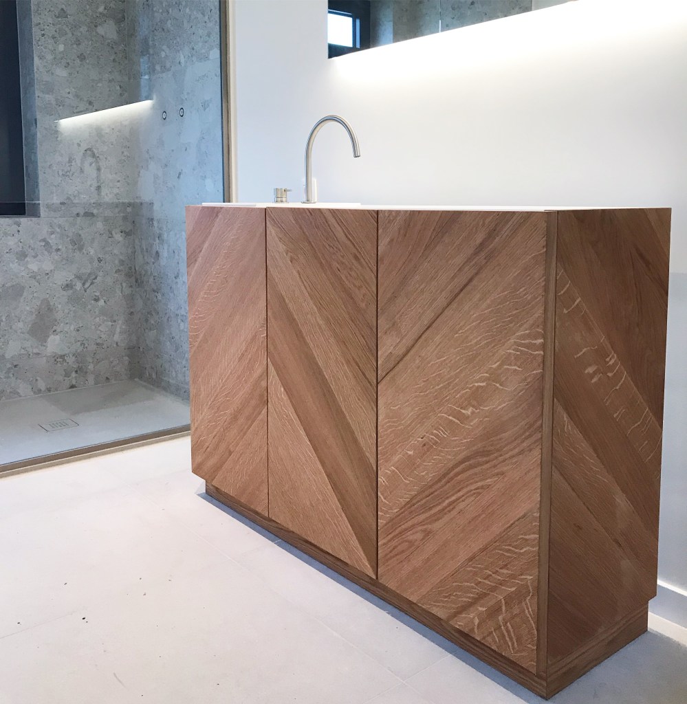 De klant wou er een ruime badkamer in creëren, met veel licht en opbergruimte en een douche die wat privacy gaf. De stijl moest natuurlijk bij de woning passen maar met een strakke boventoon. Marmer / eik en Corian waren de te gebruiken materialen.