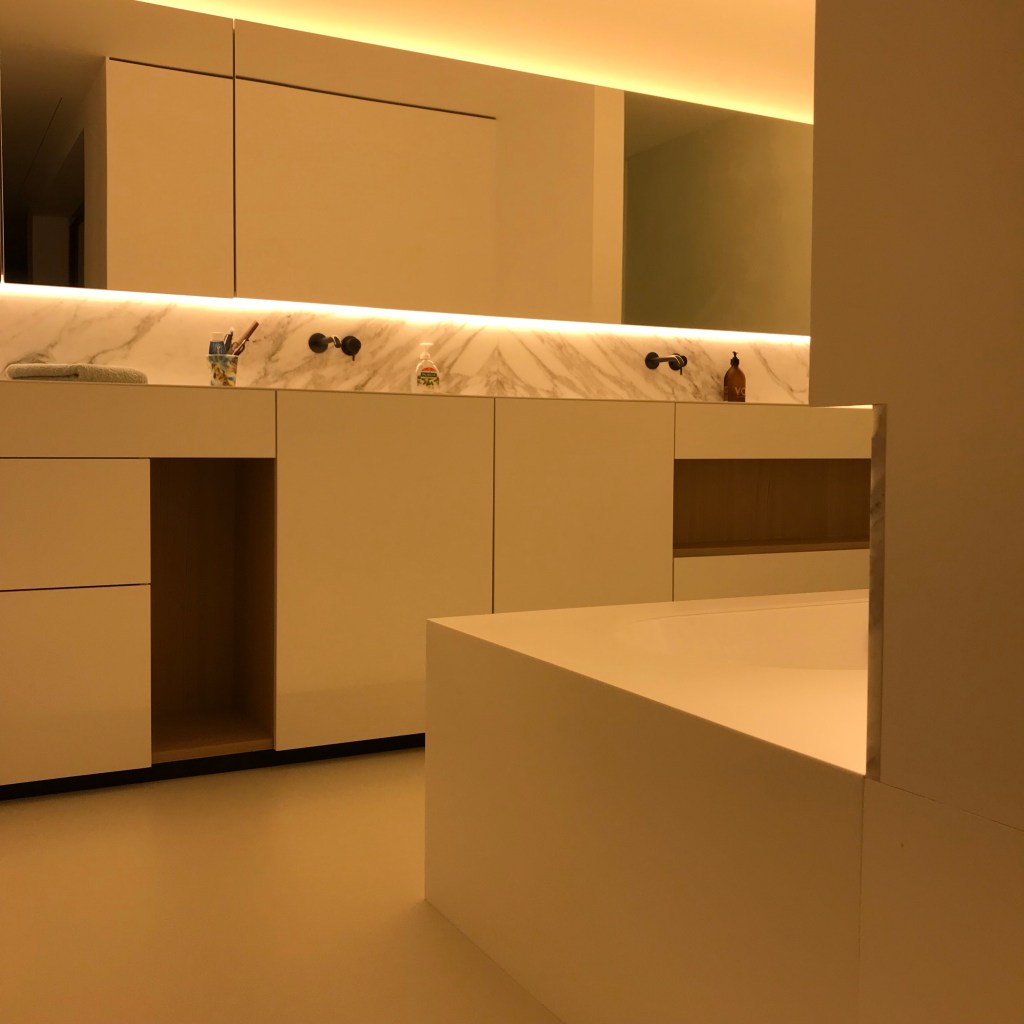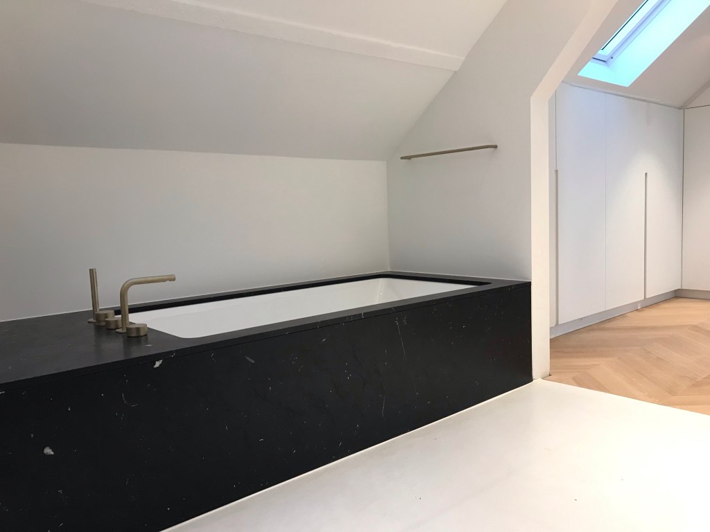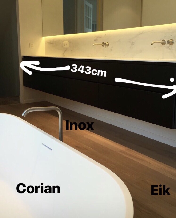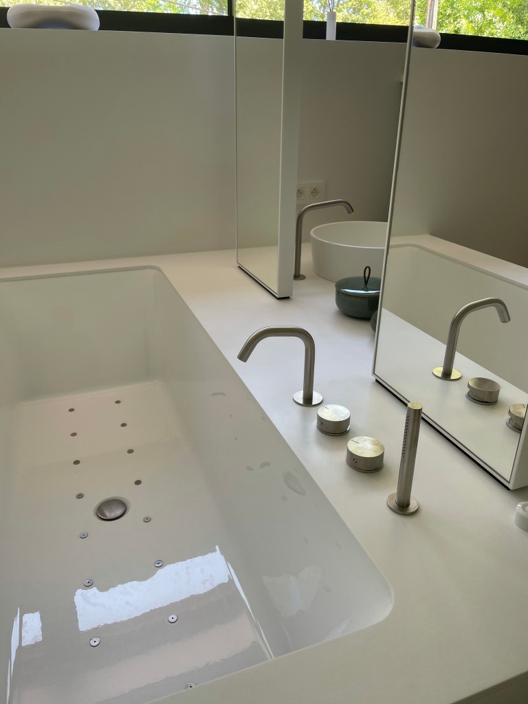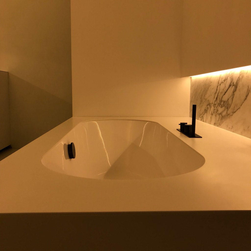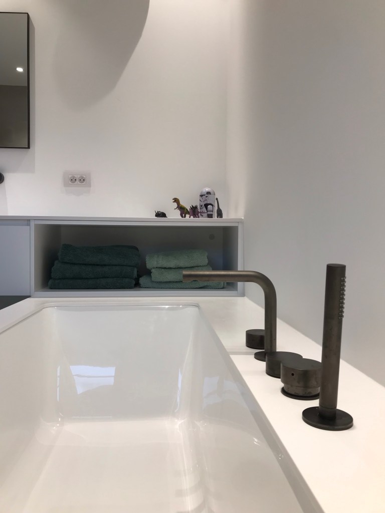 In deze nieuwbouw woning getekend door Egide Meertens leverden we 2 badkamers die gecombineerd werden met maatwerk. Het bad hieronder is van http://www.makro.it het is voorgemonteerd en geïsoleerd door de fabrikant, en de afmetingen kan je kiezen! Hier omkast met Corian maar glas, hout of cementbekleding kan ook.