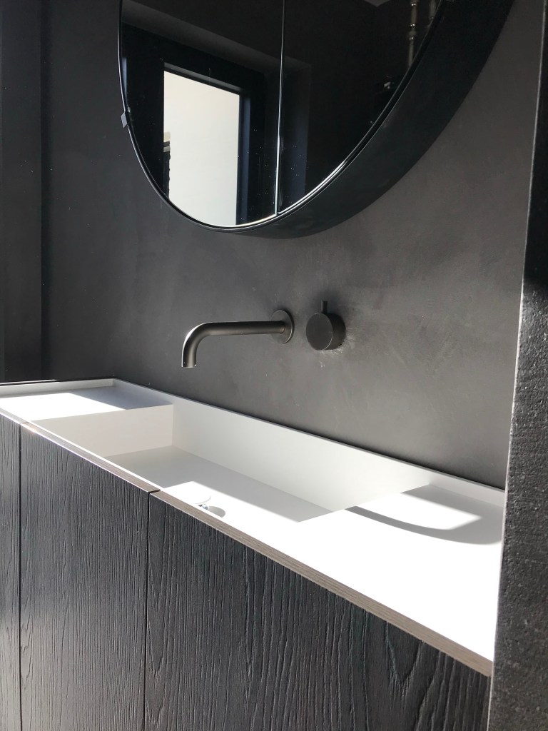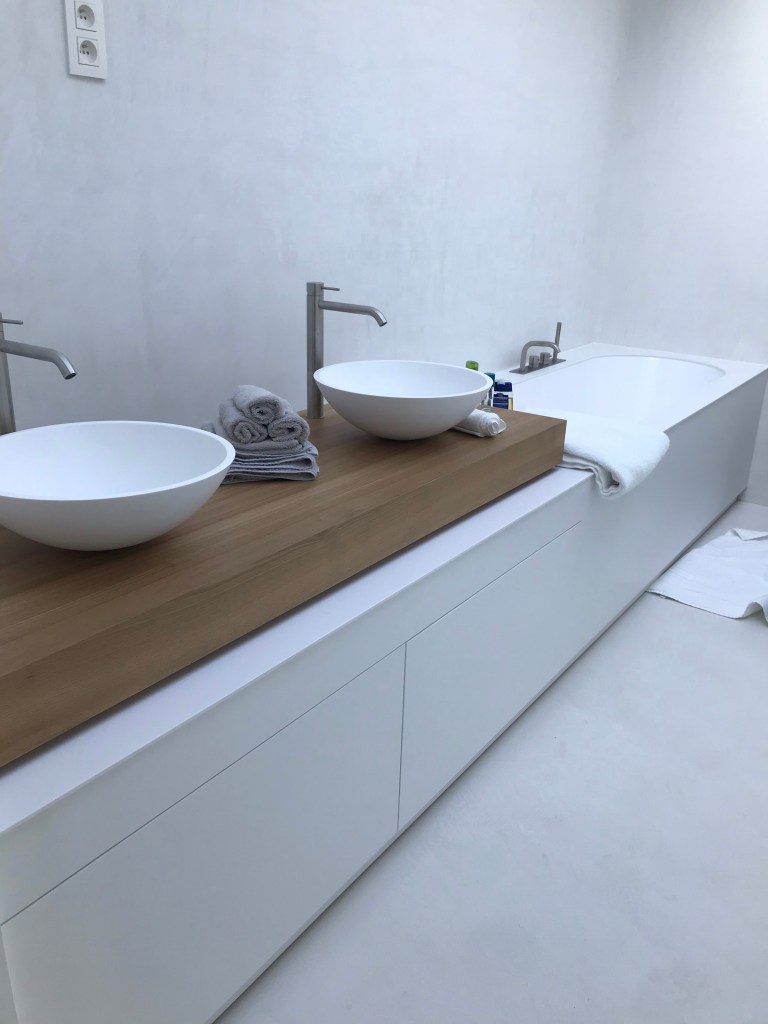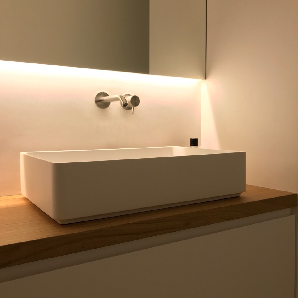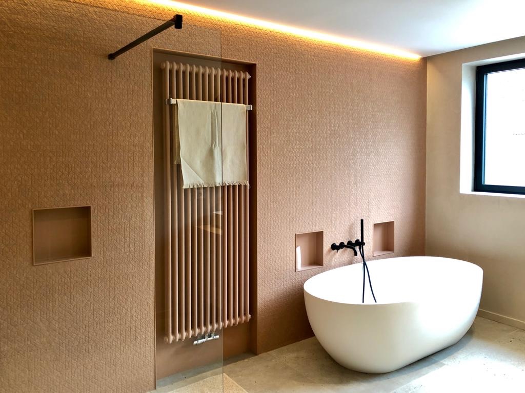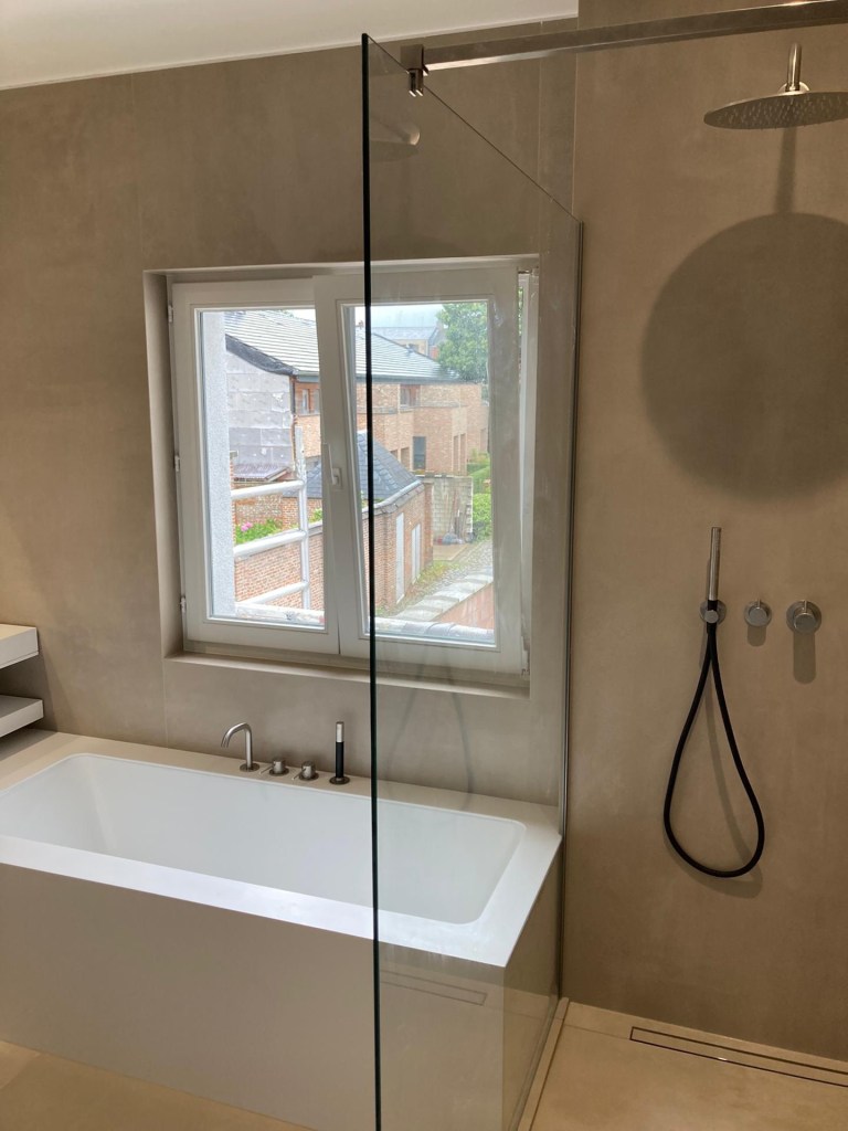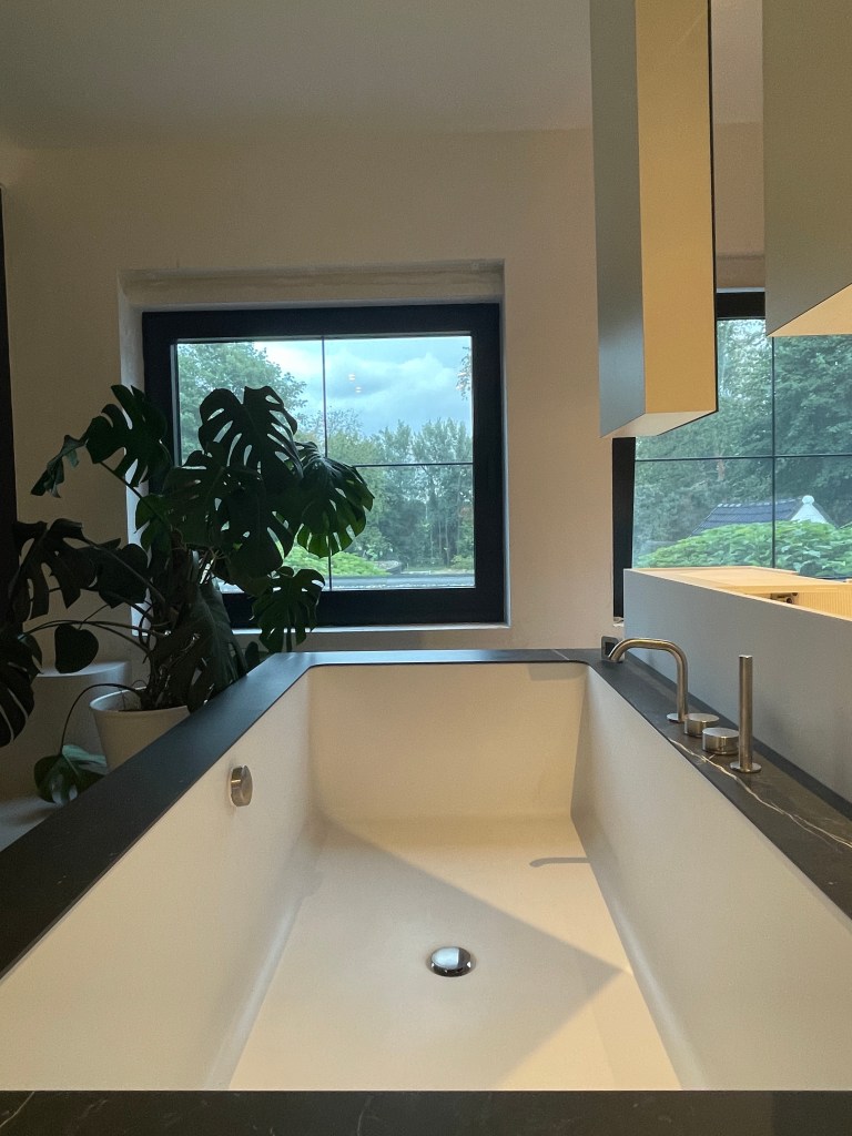 In deze nieuwbouw woning getekend door Egide Meertens leverden we 2 badkamers die gecombineerd werden met maatwerk. Het bad hieronder is van http://www.makro.it het is voorgemonteerd en geïsoleerd door de fabrikant, en de afmetingen kan je kiezen! Hier omkast met Corian maar glas, hout of cementbekleding kan ook.