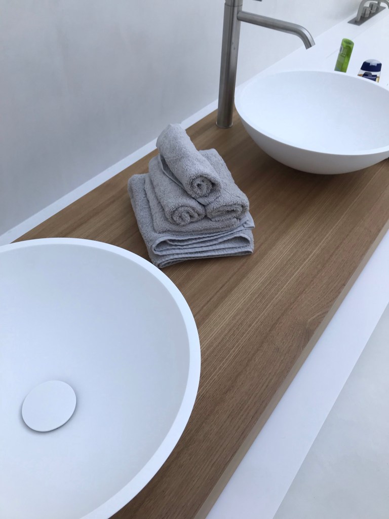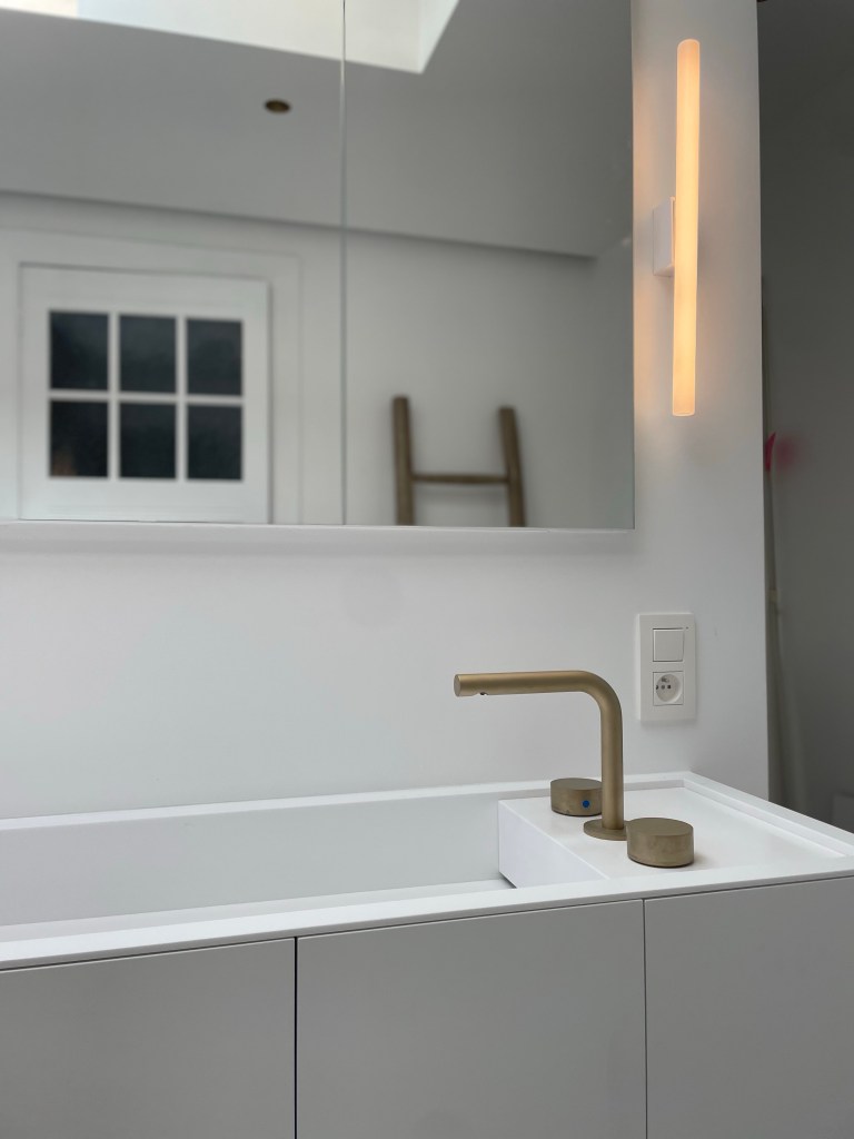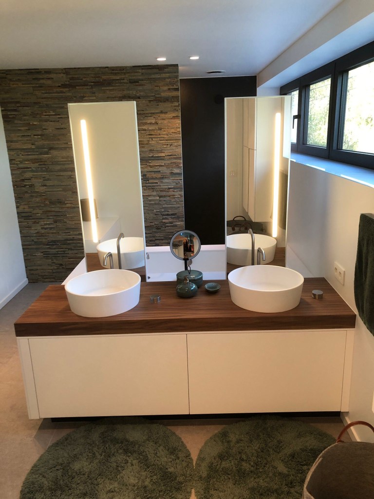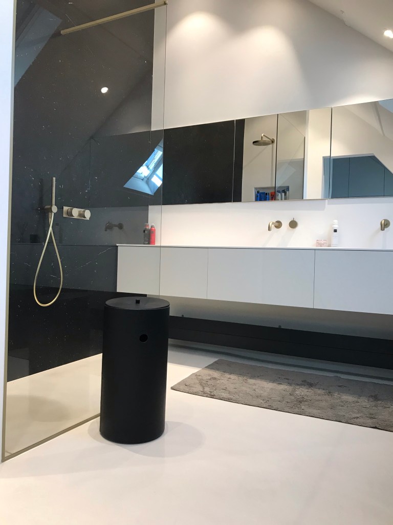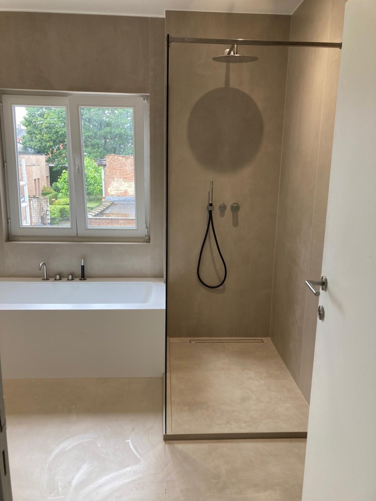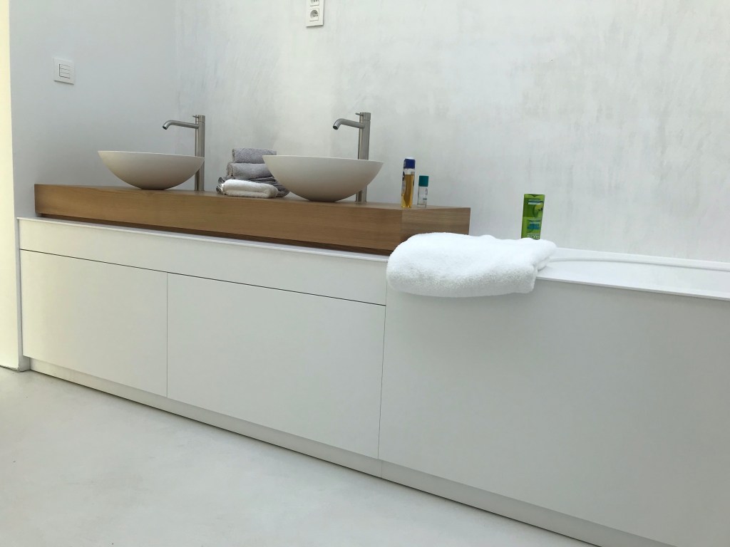 In deze nieuwbouw woning getekend door Egide Meertens leverden we 2 badkamers die gecombineerd werden met maatwerk. Het bad hieronder is van http://www.makro.it het is voorgemonteerd en geïsoleerd door de fabrikant, en de afmetingen kan je kiezen! Hier omkast met Corian maar glas, hout of cementbekleding kan ook.