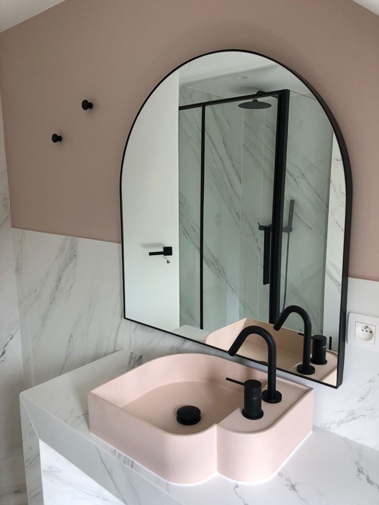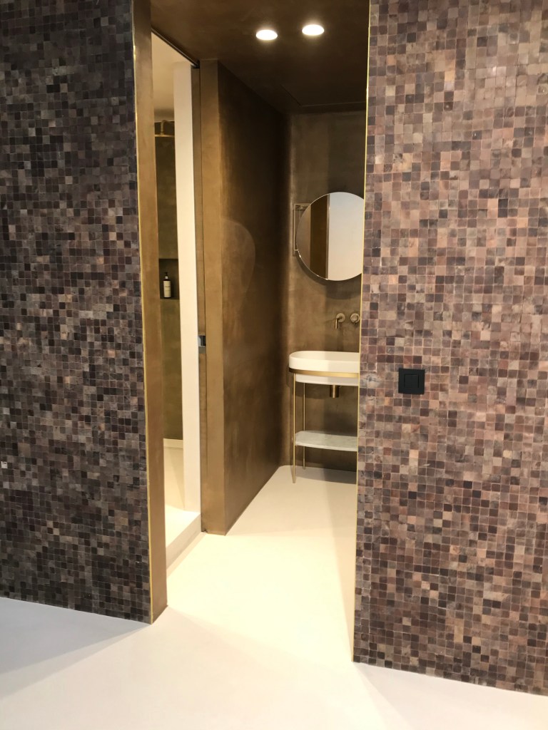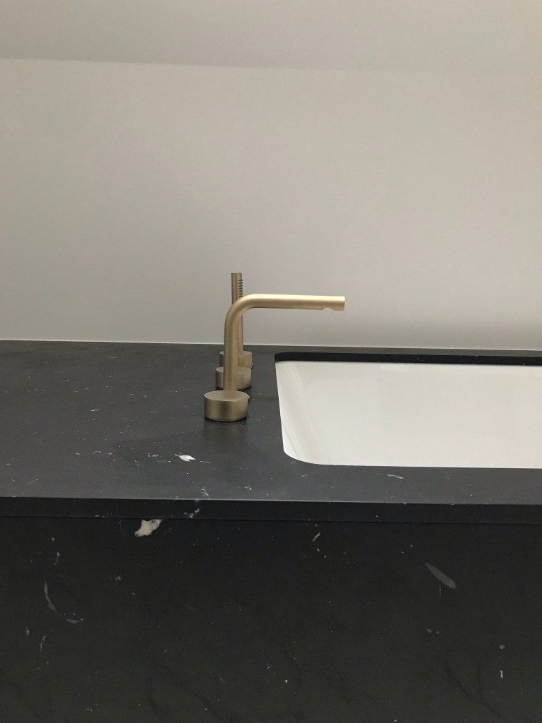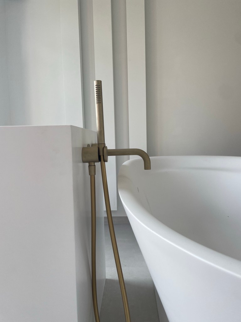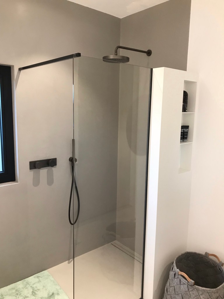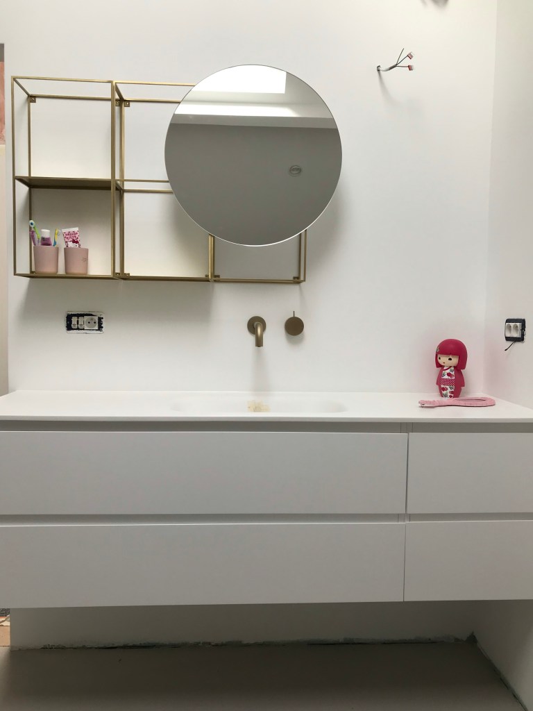 In deze nieuwbouw woning getekend door Egide Meertens leverden we 2 badkamers die gecombineerd werden met maatwerk. Het bad hieronder is van http://www.makro.it het is voorgemonteerd en geïsoleerd door de fabrikant, en de afmetingen kan je kiezen! Hier omkast met Corian maar glas, hout of cementbekleding kan ook.