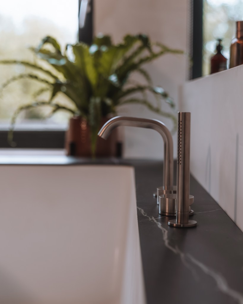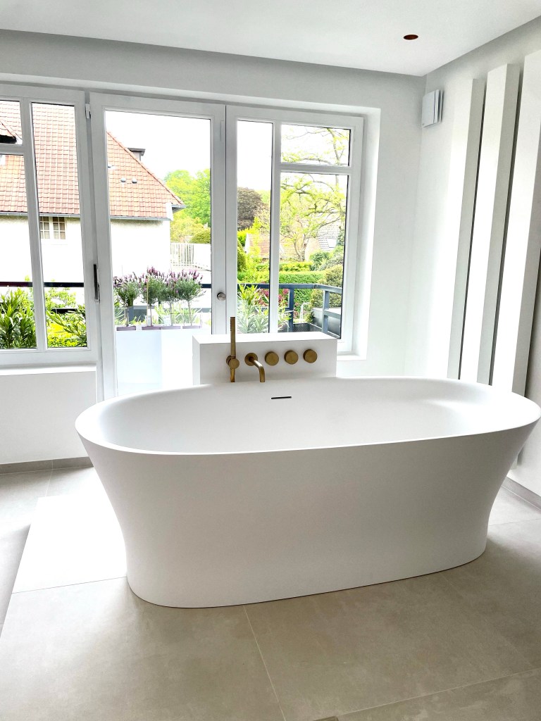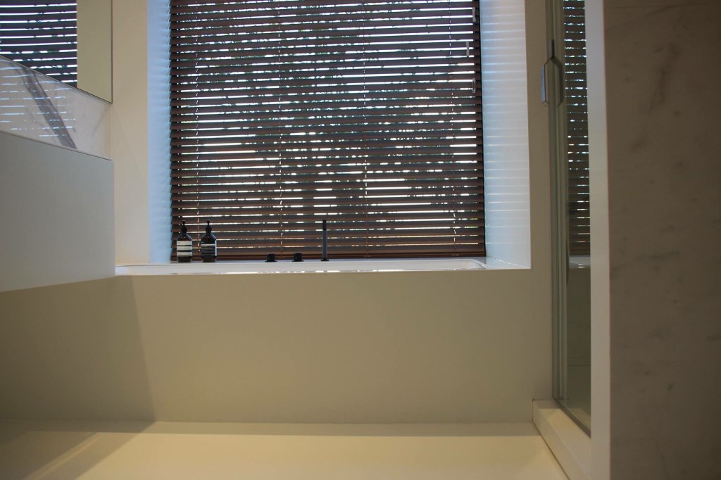 De toilet en wasmachine werden vakkundig verstopt achter een schuifdeur, het Corian bad kreeg een prominente plaats in deze mooie en tijdloze badkamer.