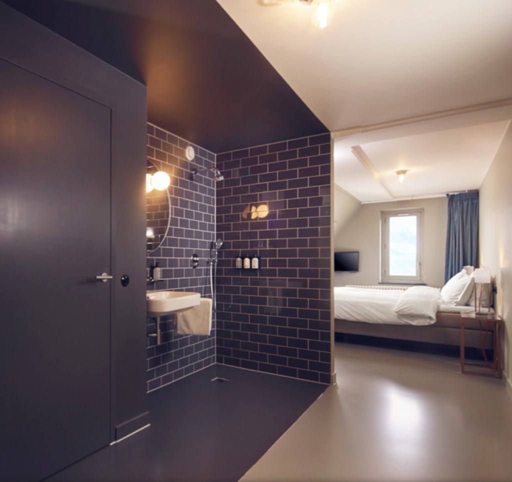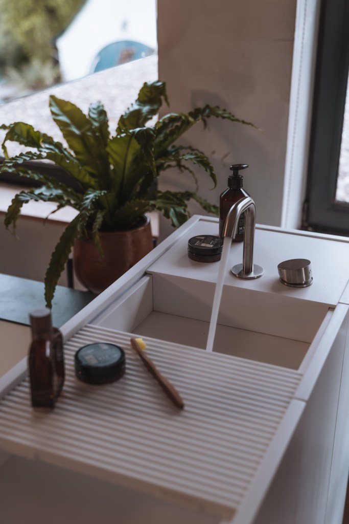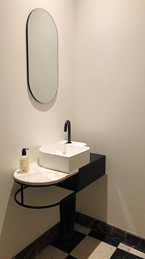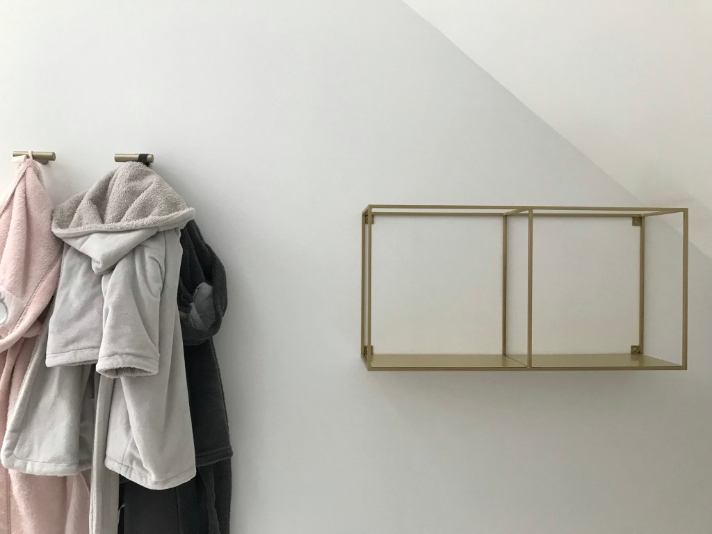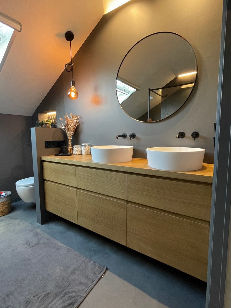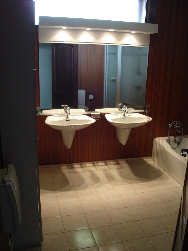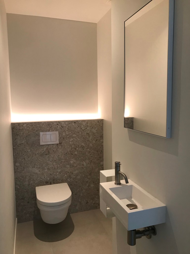 De badkamer was aan renovatie toe, foto van ná en vóór spreekt boekdelen. Soms moet je álles wegdenken en opnieuw beginnen. Alles werd van plaats veranderd. Het raam werd naar beneden openwerkt om zicht te krijgen op de tuin, en inkomdeur werd verplaatst.