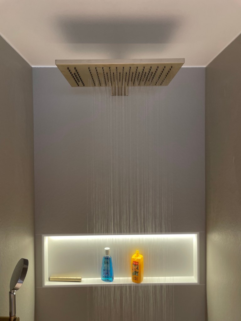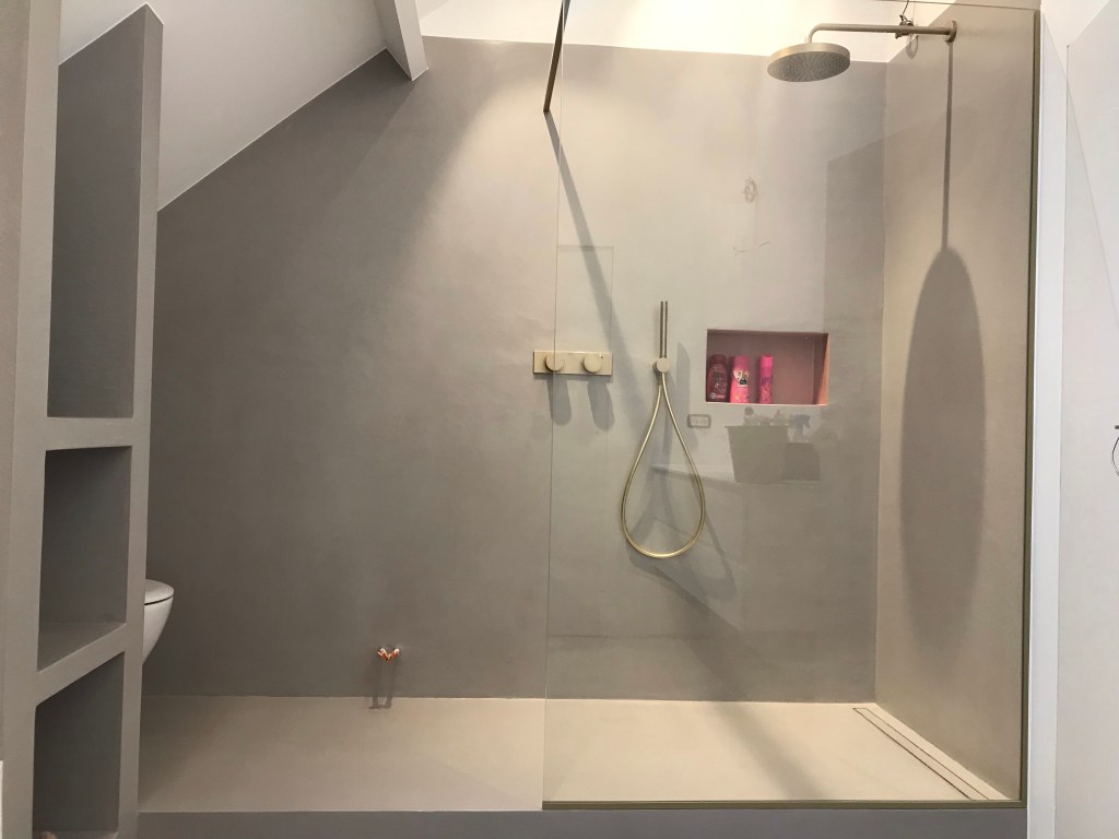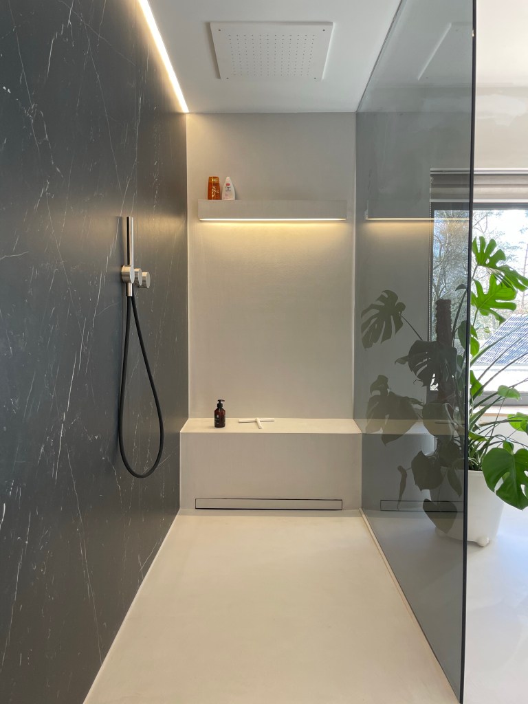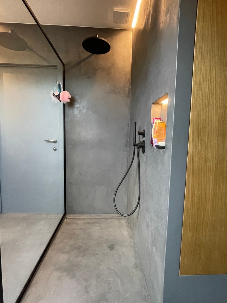 Kleine 80x90cm douche werd stoomdouche op maat, klein bad werd groot onderbouwbad van Makro.it 195x95cm. Geen opbergruimte werd veel opbergruimte. En toch is alles nog open en ruim.