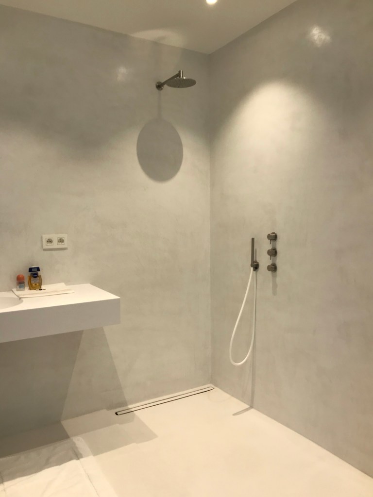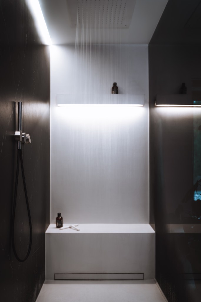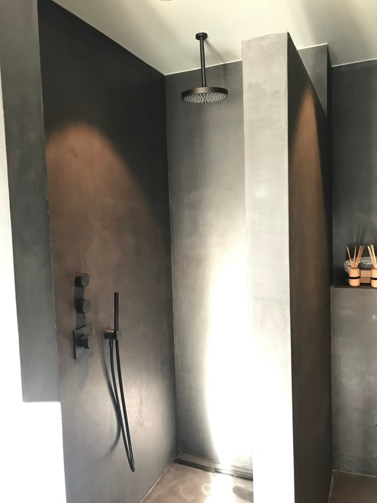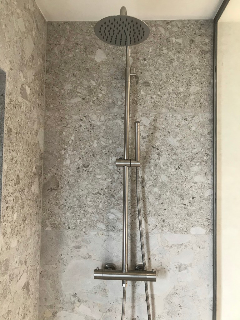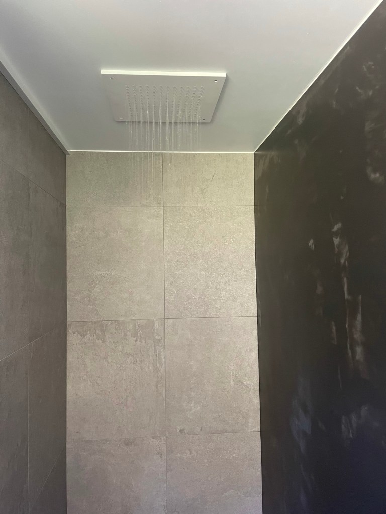 Kleine 80x90cm douche werd stoomdouche op maat, klein bad werd groot onderbouwbad van Makro.it 195x95cm. Geen opbergruimte werd veel opbergruimte. En toch is alles nog open en ruim.